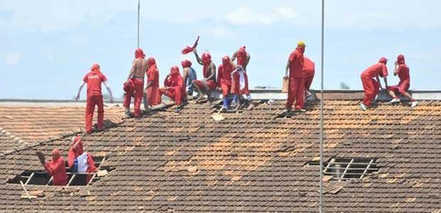 | Presos do pavilhão 1 ocuparam parte do telhado da penitenciária e arrancaram telhas para jogar nos agentes |