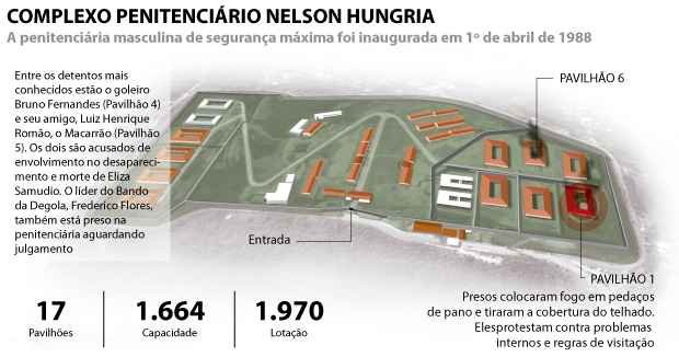 O promotor responsável pela acusação contra o goleiro Bruno Fernandes, Henry Vasconcelos de Castro, foi até a Penitenciária Nelson Hungria no fim noite desta quinta-feira. Ele disse que pretendia verificar a situação do réu acusado de arquitetar a morte de Eliza Samudio e não deu mais detalhes sobre a visita. O amigo do ex-atleta, Luiz Henrique Romão, o Macarrão, já condenado pelo sequestro e morte de Eliza Samudio, cumpre pena no pavilhão 5 do mesmo complexo. Ele deixou o local no começo da madrugada, mas não conversou com a imprensa.